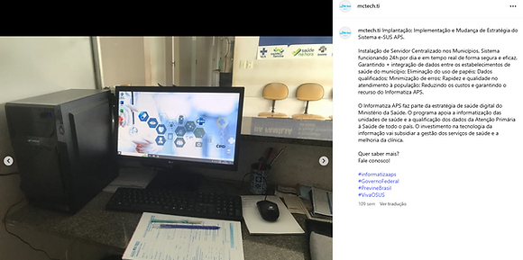 Implantação; Implementação e Mudança de Estratégia do Sistema e-SUS APS. Centralizador Municicipal funcionando 24h por dia e em tempo real de forma segura e eficaz. Garantindo + integração de dados entre os estabelecimentos de saúde do município.